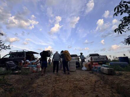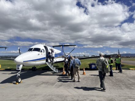 I was up at 7:00 AM, walking down for breakfast with Fred and Allan. I organized the items I was leaving behind at the hotel and was ready for the 9:00 AM departure. The driver was a little late. We left the Hilton Garden Inn around 9:30 for the charter flight. There was no real worry about being too late as it was a private charter. We picked up Jacob, the camp host, and went to the FBO located just on the edge of the main airport. We went through a little security, they weighed us, and we waited a little for the plane to be ready. There were quite a few overweight bags and nobody got charged. We took off around 10:45 AM and landed around 11:45 AM in Primavera. It is a quiet dusty little town. We left town in 4 trucks/SUVs at 12:30 PM and our driver was good at the gas/brake combo. Speed up and slam on the brakes. The roads were pretty bad and there was no relaxing. I felt a little sick but Alex switched me for the front seat and I felt much better. We arrived at 5:00 PM on the Gavilan River just upstream from camp and were loaded up in boats for the 10 – 15 minute drive to camp.