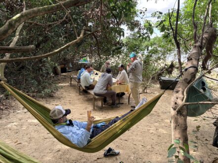The camp – which they take out at the end of every season – holds 10 people in five double occupancy floating cabins on a sandy beach. There were 6 of us from The Fly Shop® (Steve, Fred, Allan, Neal, Alex and myself), Arturo and Dario from Italy, and Scott and Bryan from Wyoming and Georgia, respectively. Although mobile, they put the cabins on the beach for the season and only move them once the season is over. Although not deluxe, they have everything you need to be comfortable for the week. Two beds with nets over them, a fan for each bed, a vanity sink, toilet and cold water shower. The open-air design allows for lots of ventilation in the night. Dinners are taken in the open-air dining tent, and the ladies preparing the food do an amazing job. Full buffet breakfasts, dinners and lunches with lots of local beef, fish, and veggies. The river is in an area of Colombia that is mostly savanna grasslands, with a jungle riparian habitat along the river. This is the land of large finkas (ranches) – with cattle and cowboys that stretch all the way into Venezuela. There are plenty of birds and critters located along the river corridor.