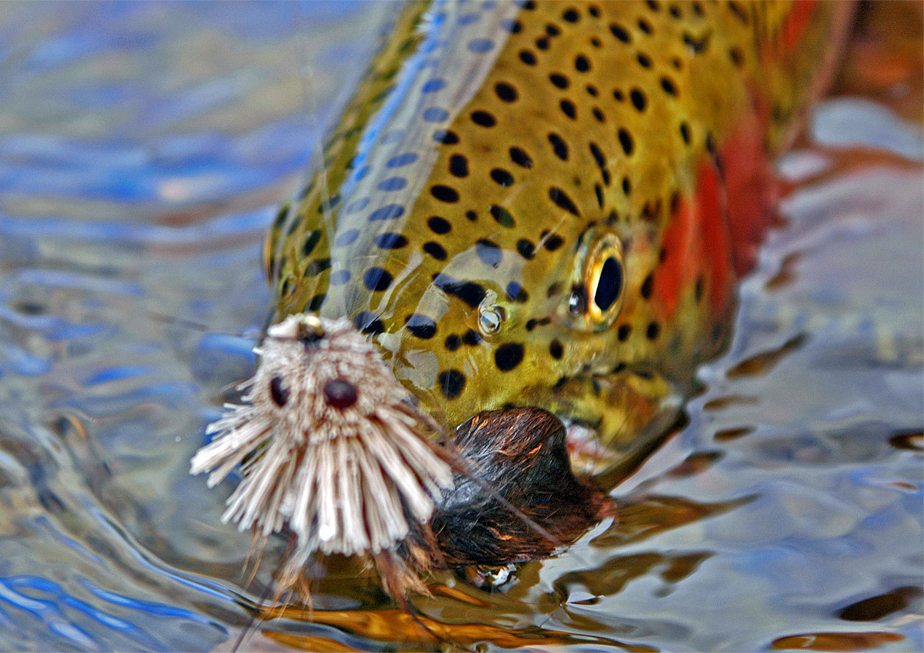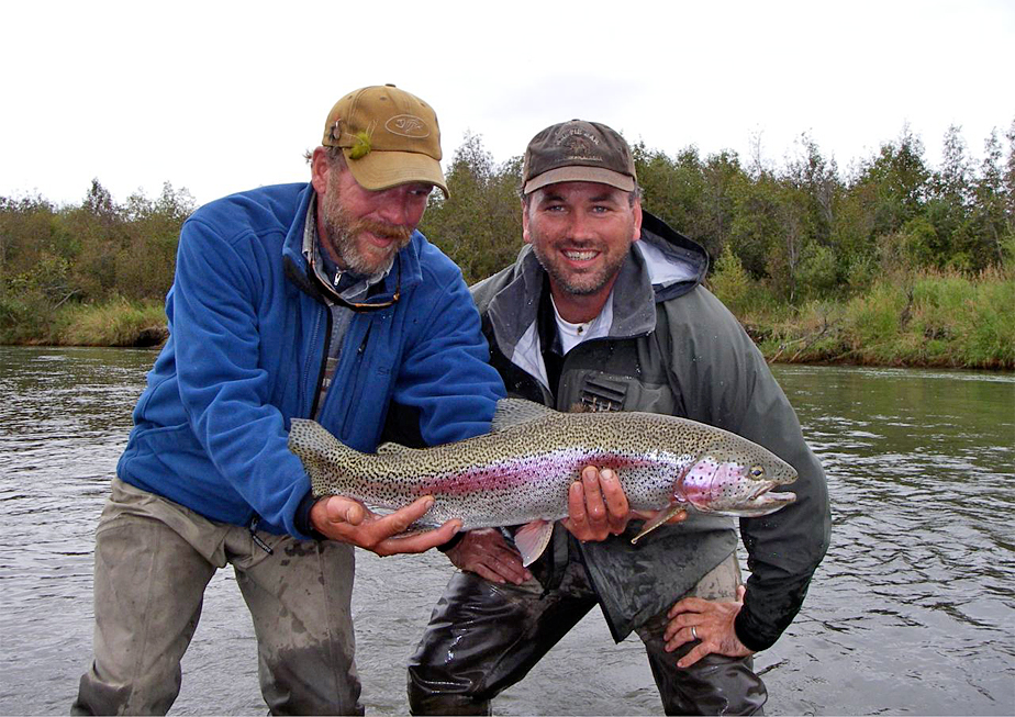 their eggs. This time of year the trout, dolly and fishing is phenomenally productive, primarily dead-drifting single egg patterns, nymph-style. As later August approaches, fishing white streamers that resemble chunks of drifting, decomposing salmon flesh also become quite effective, as do the mouse flies again; this late season is probably the single best time to target the largest trout in the river. As well, August marks the best silver salmon fishing, a guest favorite for their aggressiveness to a fly, and acrobatic fighting tactics.