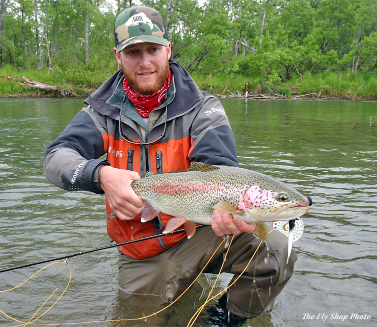 into July. The lower river is fairly wide – spey rods are recommended - and comprised of a series of long, deep beautiful runs, perfect for swing fishing to these brutes. An average king here will be 20-25 pounds, with fish over 40 an everyday possibility. As well, the river's sockeye and chum salmon runs overlap the kings, and offer good sport for those looking for a bit smaller game – sockeyes average 6-8 pounds, and the chums 8-12 pounds. This same early season stretch will also see the river's big leopard rainbows aggressively chasing large streamers – trout in the 2-4 pound range are common, and even larger fish are routinely hooked. Look for the annual upstream migration of sea run dollies to begin in this same time period, making this is a great mixed bag time of year.