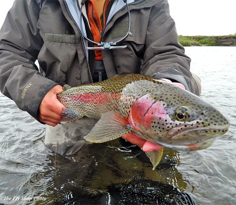 As July segues into August, two major events occur. First, hordes of chrome silver salmon invade the river, their sheer numbers inundating every slow pool and calm backwater in the river. These aggressive-to-the-fly battlers are a flyrodder's dream, averaging 6-12 pounds, and willing to take surface poppers as well as streamers. Secondly, as all of the earlier-run salmon are now laying eggs, or dying and decomposing, the river's trout populations are taking up sharply defined feeding positions; anglers can either catch big numbers of good-sized rainbows (and dollies) in shallow spawning redds behind procreating salmon, or plop heavy flesh patterns against the banks behind drowned alders in search of fewer, but larger specimens. This will remain the drill into September, when the camps close down.