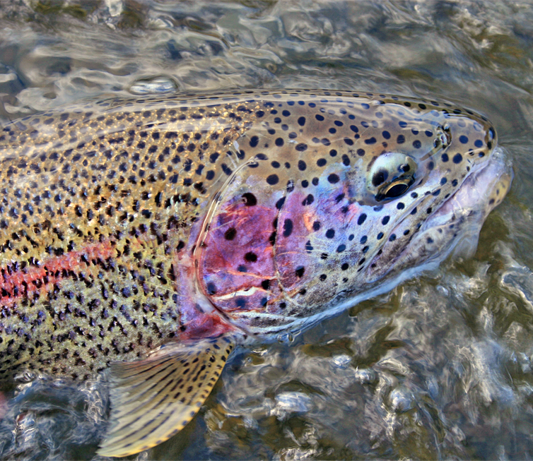 • These beautiful leopard rainbows live in the river year round, not retreating to a lake to overwinter, so you don’t have to be concerned with being there at a time when the trout are still in a lake. With so little pressure, they respond well to skated mice and swung streamers, as well as egg flies. The trout are always there, and you can catch them all season on a variety of fly types, not relying only on eggs.