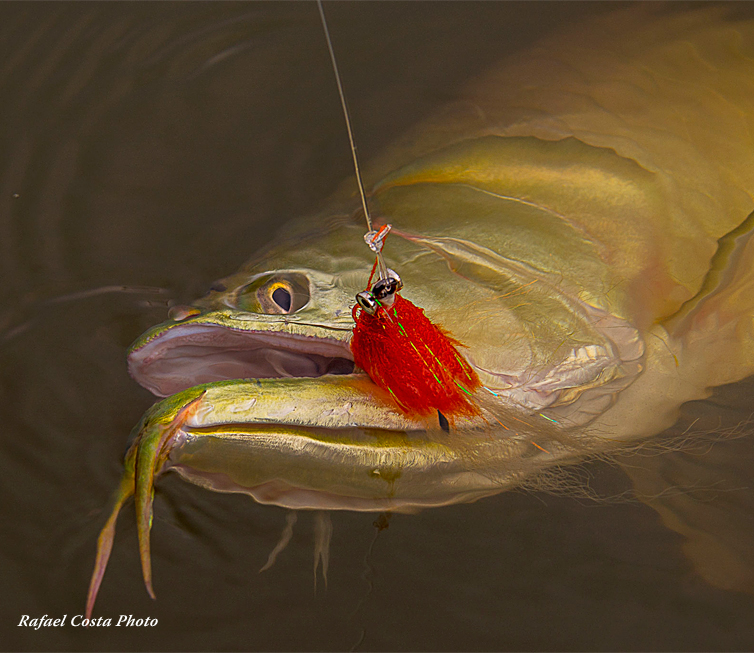 These fish range from 20-100 pounds and are found in good numbers in the shallow lagoons, inland lakes, and along the edges of the lake and channels. These fish hit a fly incredibly hard and, once hooked, they pull extremely hard and frequently explode in acrobatic aerial displays. Floating or Intermediate lines are best, on either a 10 or 12 weight rod. When these "small" arapaima are actively feeding in shallow water, they offer consistent action with multiple hookups.