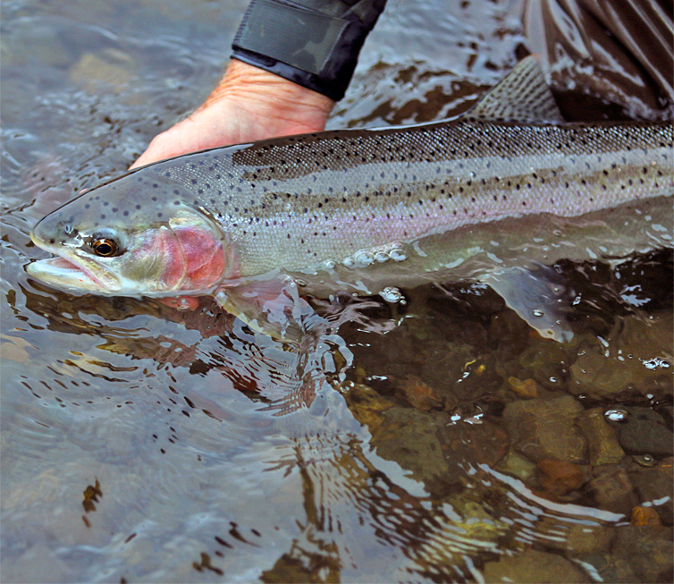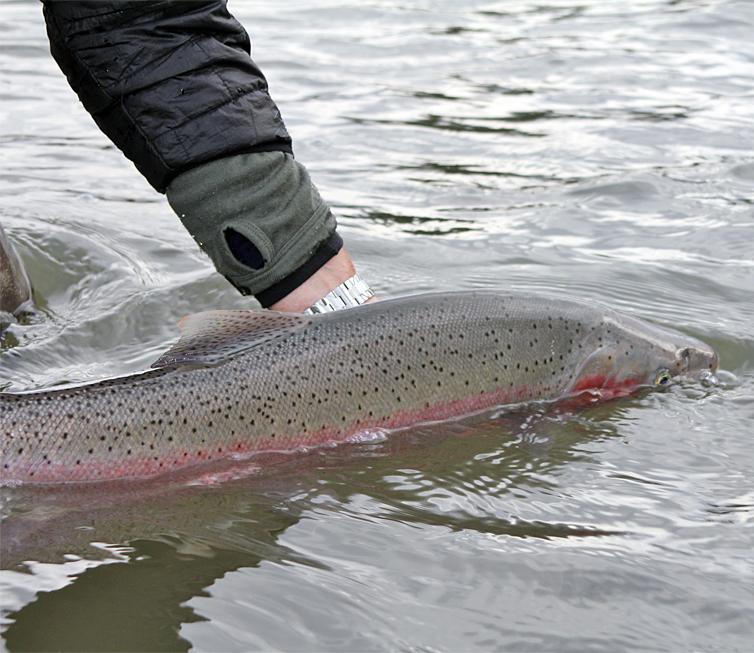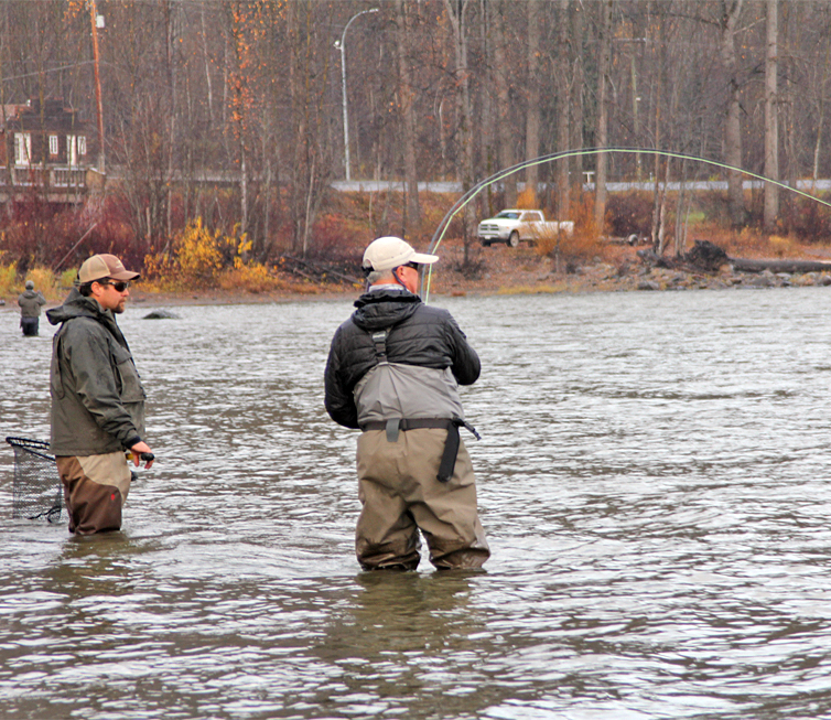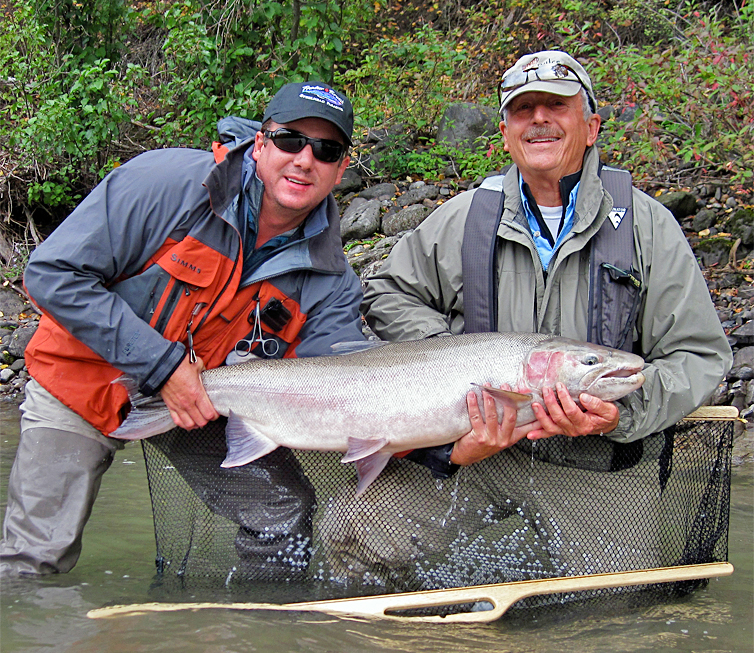 continued through September into the first part of October with sink tips working when the fish won't move to the surface. Mid September through mid October is a very popular time because the river is generally loaded with fish and while the waters are cooling, the fish are still very active. From Mid October into November the waters definitely get cooler, as autumn gives way to early winter conditions. The trees on the mountainsides are in beautiful coloration or may even get a dusting of snow. This is an exciting time to be there and it is the time for truly big steelhead.