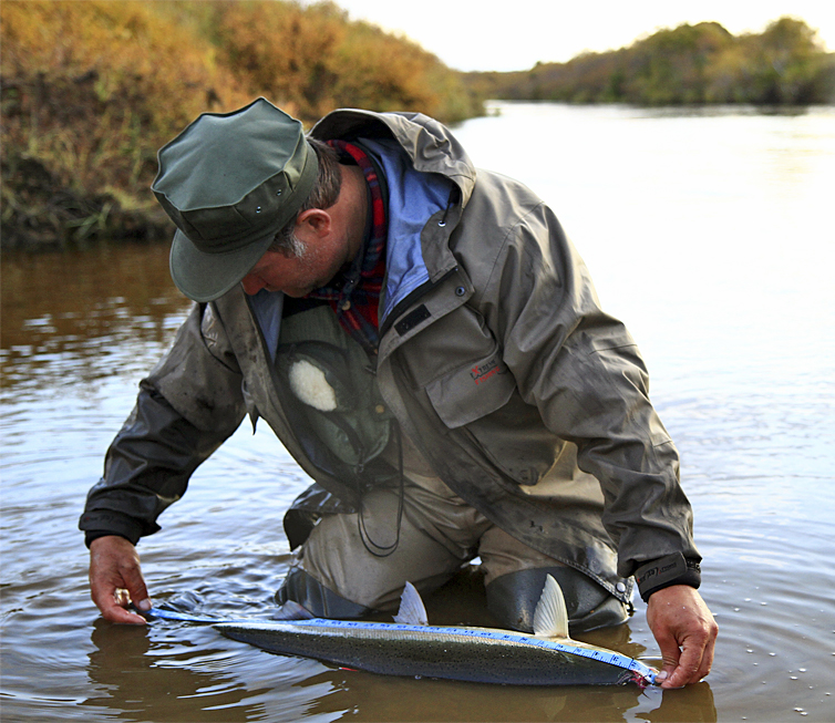 The methods used to catch Kamchatka steelhead will be familiar to those used to catching them in British Columbia, Alaska and the Lower 48. By using a down-and-across swing method of fly presentation, we're able to solidly hook the fish, hopefully bring it to hand, take a sample of a few scales, tissue for DNA, and record its length, girth and sex. Finally, the fish is marked dorsally with a numbered tag so that if we catch it again, growth and life history data can be compared. One of the great advantages of using anglers to collect samples (as compared to old style methods of gill nets or seine nets) is that we can make our studies of the fish and then release them alive. No harm is done to the overall population.