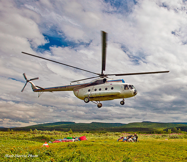 The Purga offices are located directly adjacent to the main heliport in Yelisovo/Petropavlovsk. They have a lounge area with chairs, and will set out hot water for tea, instant coffee, and usually some snacks while you wait for weather clearance. Sometimes they may drive you an additional 20 minutes to a different heliport, depending on where they can get weather clearance first. As soon as the pilots get the okay to fly, they will load your gear onto the helicopter, then the group will load up for the short, incredible flight into Zendzur Lodge. Sometimes they may drive you an additional 20 minutes to a different heliport, depending on where they can get weather clearance first.