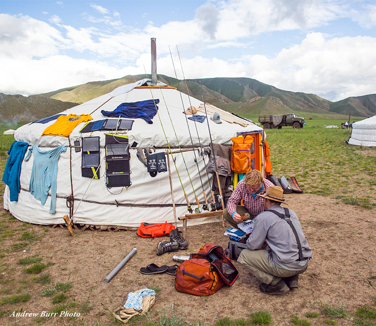 • Guests on our Mongolia float trips enjoy amazingly comfortable accommodations in the riverside ger camps. The gers provide ample space to accommodate two anglers, outfitted with all the essentials: wood burning stove, wash-basin, small writing table, camp chairs, and sleeping cots. Each camp has simple toilet and shower facilities. The toilets are clean, efficient, and private. The shower is placed in an insulated wall tent complete with a wood stove. The shower is private and warm, with plenty of space for changing. The stove is a nice touch, with hot water making the shower feel like a steamy sauna. These traditional dwellings are cozy, aesthetically pleasing, and environmentally and socially appropriate for the wilderness of the Mongolian countryside, each one situated along a uniquely beautiful stretch of river with great fishing right out the front door.