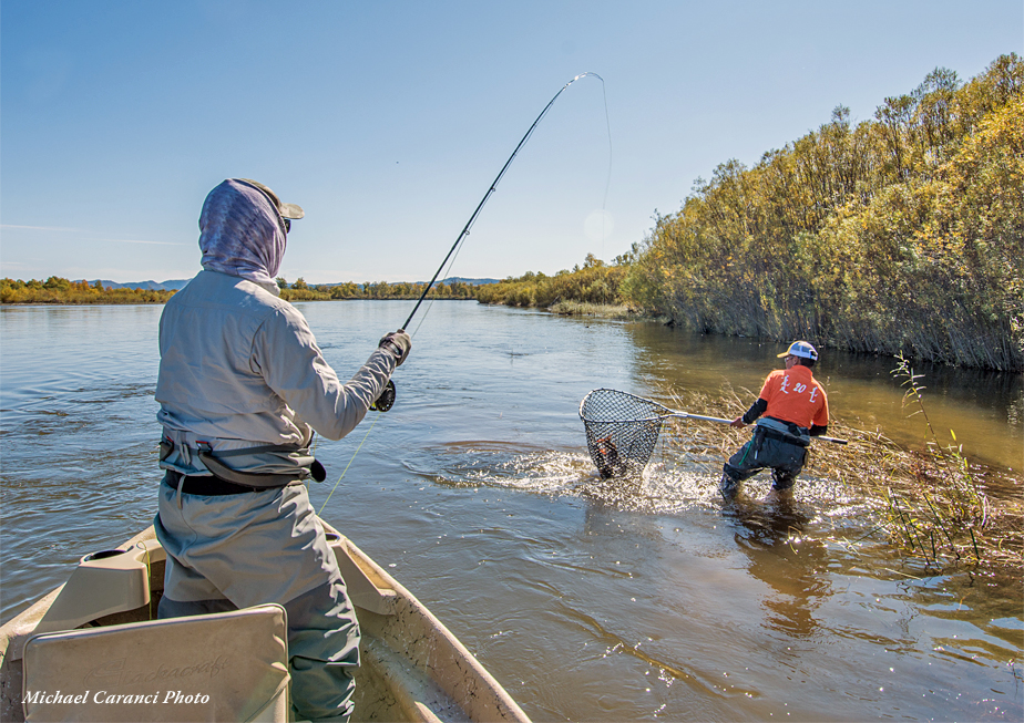 The fishing is a combination of drift boat and wade-walk fishing, and it is a great river for both single and double-handed rods. The single-handed rods are used from the drift boats. The double-handed rods are generally fished from shore, but some guests use switch rods to great effect from the boat as well. Most guests bring a five-weight single hand for the trout and a nine-weight single hand for the taimen. Both of these rods will have a dry line. The double-handed rods for taimen can be a bit lighter,