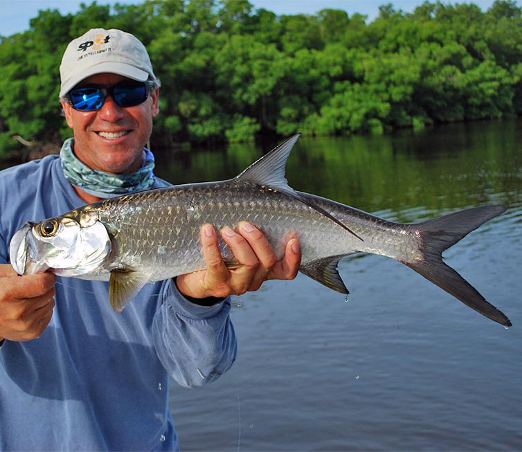 cruising tarpon weighing in between 5 and 15 pounds, with a few over that weight. Casts will vary from very precise, under-the-branches type of casts to open water searching casts. Almost all of the tarpon should be sighted before casting unless there has been a lot of wind and/or rain. The lunch is eaten on the boat and fishing continues to 2:00 – 3:00 PM, when it is back to the hotel in time for a siesta and clean-up to get ready for dinner on the town. The guide or hotel will be happy to recommend a restaurant to your liking.