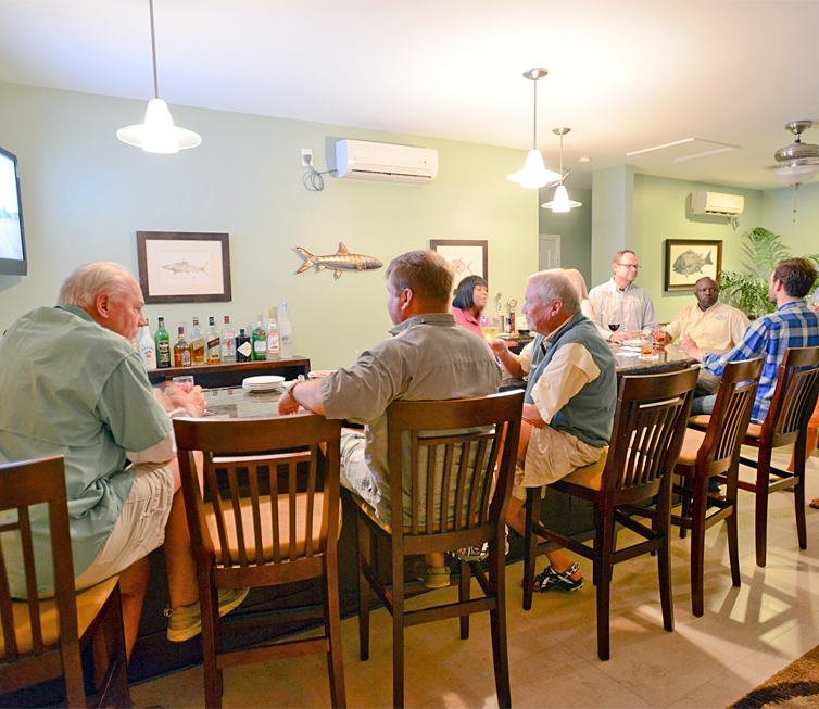 feature private bathrooms with granite countertops, a shower with great water pressure, plenty of hot water, and a separate, closed off "bathroom." The rooms open to a large deck area that overlooks the crushed coral courtyard, a large fire pit, the docks and marina, and the ocean itself. The main lodge building features air conditioning a small sitting area, a well-stocked bar, and a full dining area. The lodge also has a high definition flat screen TV with DIRECTV, so you can always tune in to the big game after your day of fishing.