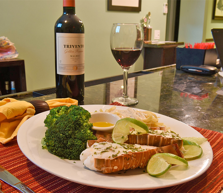 Each morning, breakfast is cooked to order and served in the dining room. Order eggs, bacon, sausage, pancakes, waffles, toast, just about anything you like, the chefs can prepare. There are plenty of fresh fruits, cereal, yogurt, juice and coffee for those wanting a light start to the day. Lunch is taken on the fly and your custom ordered packed lunch will be loaded in to the boat each morning along with plenty of cold drinks for your fishing day. Dinners each evening are a mix of Bahamian and American style cuisine. You can expect a great selection of fresh seafood, chicken, ribs, pastas, salads, homemade soups, and a variety of side dishes. Complimentary wine is served with dinner. McLean's Town (the location of the lodge) bills itself as the "Conch Cracking Capitol of the World," and the lodges conch fritters are some of the best in all the Bahamas! If you have any special requests or dietary restrictions, the kitchen staff can take great care of this for you with advanced notification.