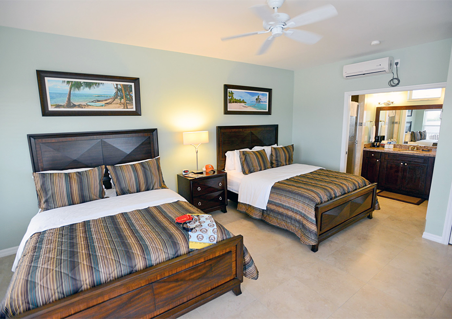 There are two main buildings at East End Lodge. One building has three, double occupancy rooms all connected by a large front porch that overlooks the water and lodge compound. The second building includes two double rooms along with the main lounge, bar and dining area. These are new structures, less than 5 years of age and are very nicely designed, built and furnished. Each bedroom at the lodge features two full sized beds, large dressers, night tables, reading lights, air conditioning, and plenty of closet space for all of your gear and luggage. The guestrooms