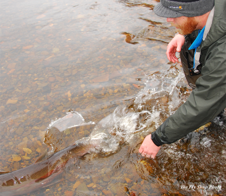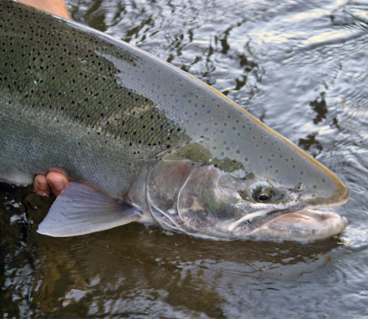 A steelhead is a rainbow trout (Oncorhynchus mykiss) which is born in a river and then, after a juvenile period, migrates to the sea like a salmon. Eventually, after usually 2 or 3 years, they return to their natal streams to spawn. While most steelhead will die after spawning, some will return to the sea and survive to spawn again. What triggers a salt water migration in some trout but not in others remains a thing of a mystery, but whatever the reason, their oceanic journeys are legendary. For instance, a tagged steelhead of Columbia River, Oregon origin was once recaptured off the coast of Japan; and unlike salmon, which maraud the high seas in schools, steelhead swim solo. These unique characteristics add to the intense mystique ascribed to them, but ultimately it’s the size and power of a steelhead, gained in the ocean, that is the draw to fly fishers. This “transformation” from rainbow trout to steelhead – from meager river origin to the supercharged energy of the sea – is like that of Superman before and after stepping into the phone booth.
