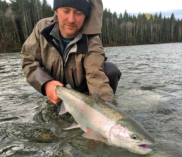 A steelhead is a rainbow trout (Oncorhynchus mykiss) which is born in a river and then, after a juvenile period, migrates to the sea like a salmon. Eventually, after usually 2 or 3 years, they return to their natal streams to spawn. While most steelhead will die after spawning, some will return to the sea and survive to spawn again. What triggers a salt water migration in some trout but not in others remains a thing of a mystery, but whatever the reason, their oceanic journeys are legendary. For instance, a tagged steelhead of Columbia River, Oregon origin was once recaptured off the coast of Japan; and unlike salmon, which maraud the high seas in schools, steelhead swim solo. These unique characteristics add to the intense mystique ascribed to them, but ultimately it’s the size and power of a steelhead, gained in the ocean, that is the draw to flyfishers. This “transformation” from rainbow trout to steelhead – from meager river origin to the supercharged energy of the sea – is like that of Superman before and after stepping into the phone booth.
