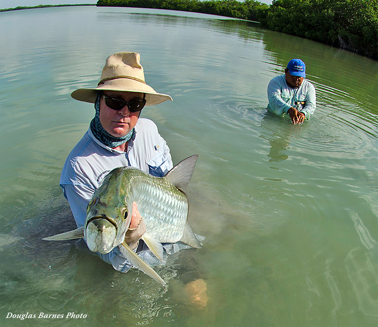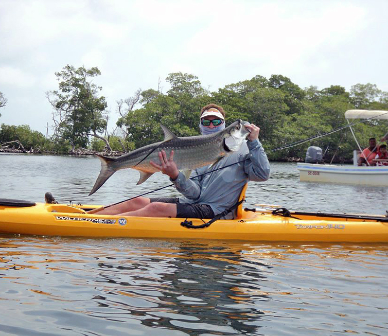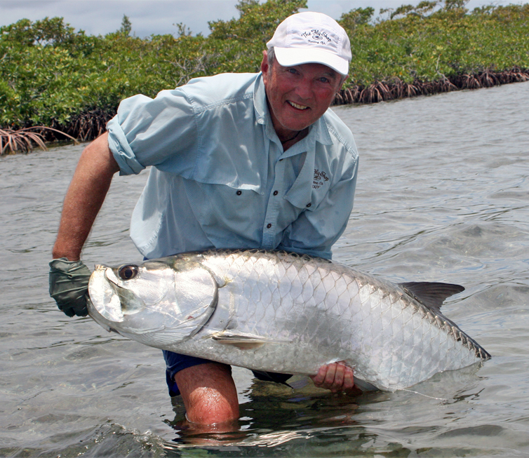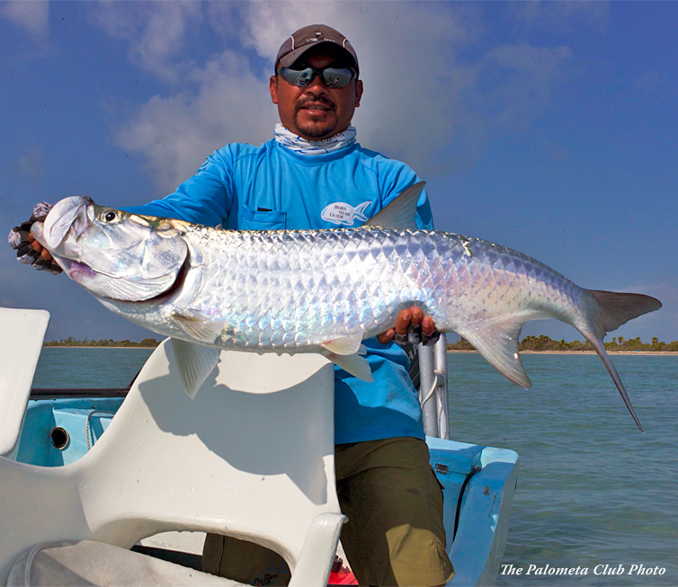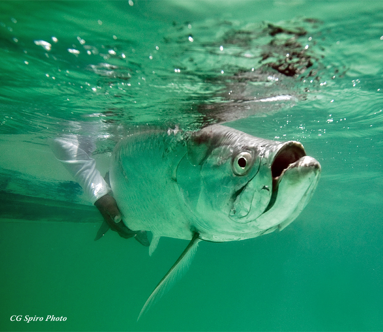 Tarpons grow to about 5-8 ft. long and weigh 80-280 lbs. They have dorsal and anal soft rays and have a bluish or greenish back. Tarpons possess distinctive lateral lines and have shiny silvery scales that cover most of the organism except for the head. Tarpons have large eyes with adipose eyelids and a broad mouth with a prominent lower jaw that juts out farther than the rest of the face.